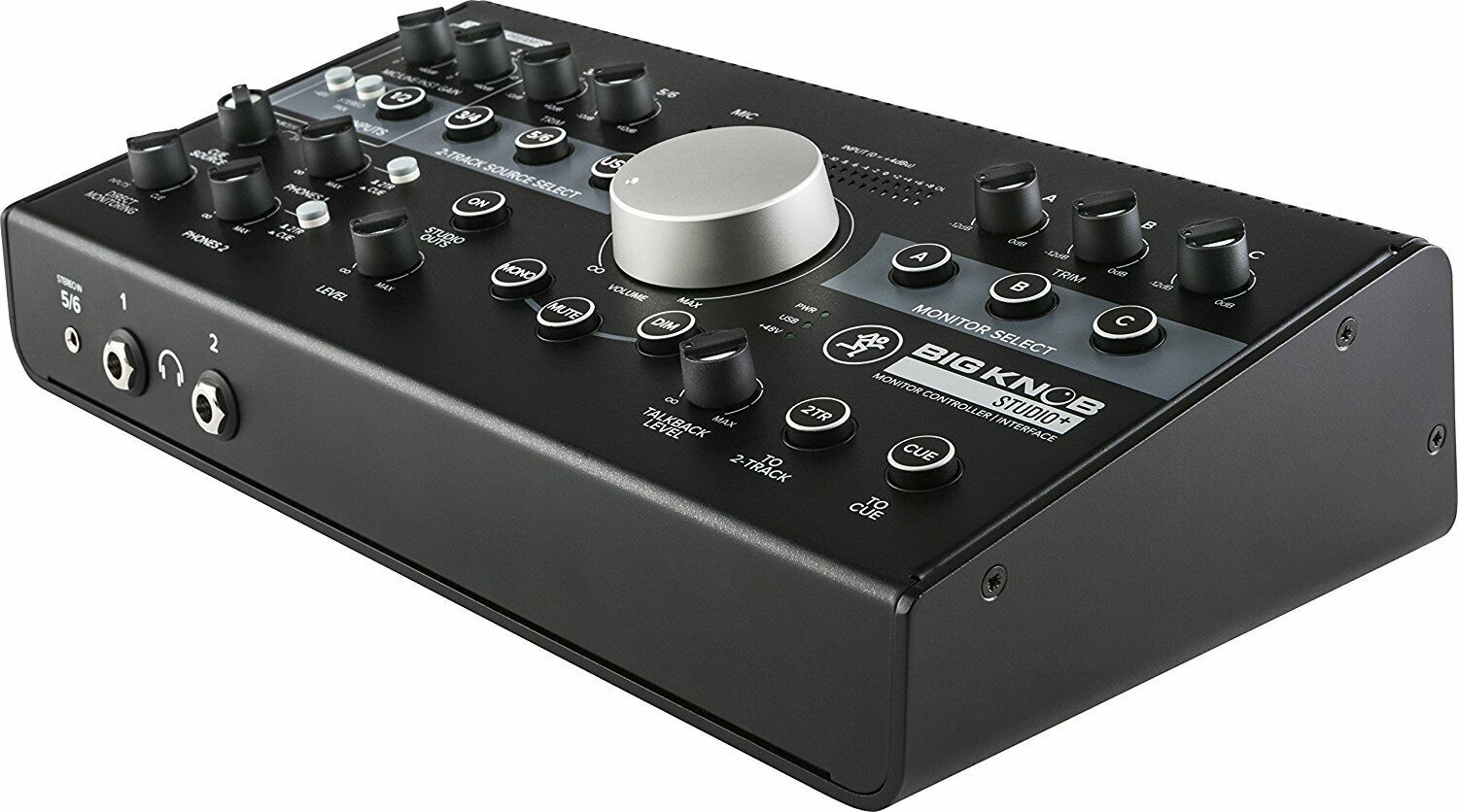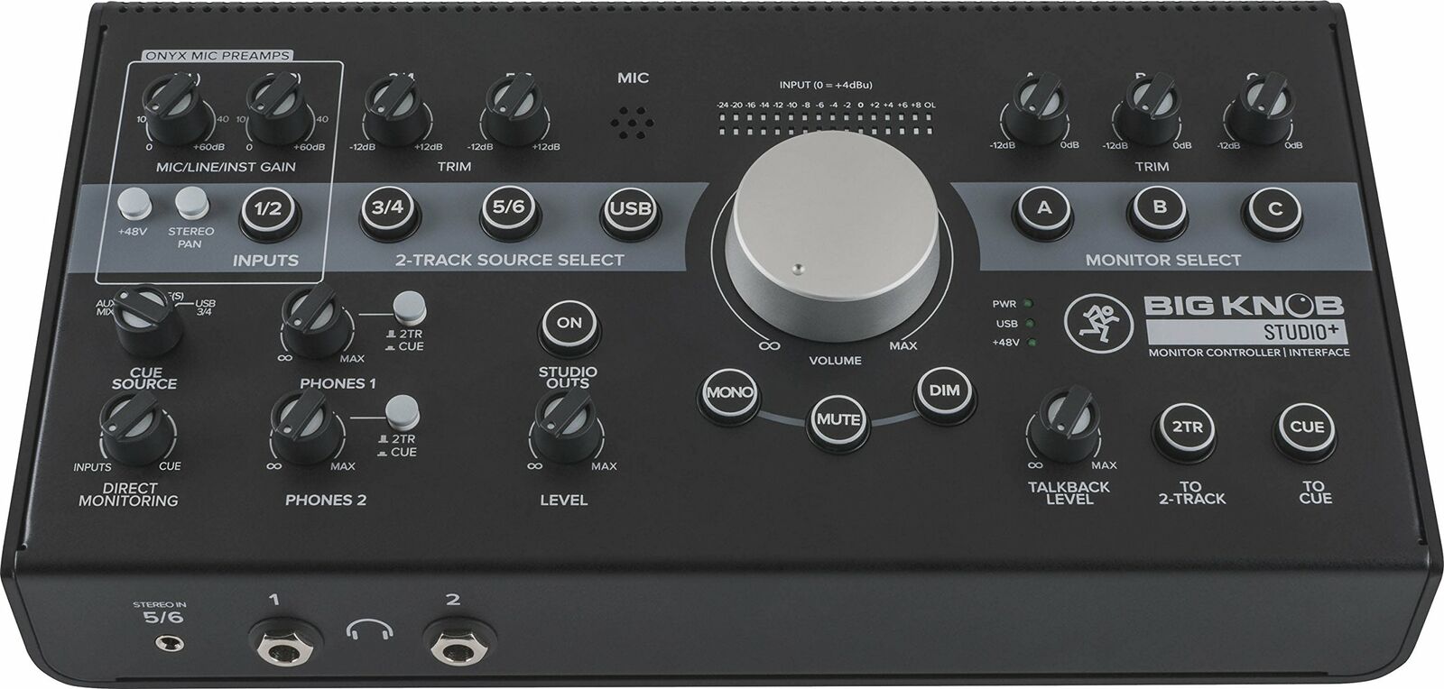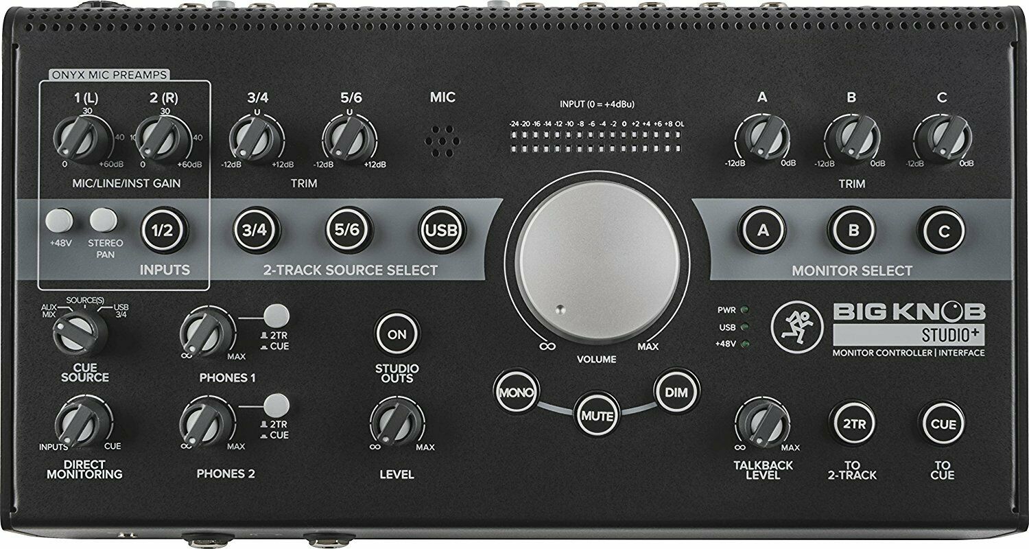 Combining comprehensive control over your studio monitors with a high-resolution USB audio interface, the Mackie Big Knob Studio+ delivers big value for project studios. Dedicated buttons on the Mackie Big Knob Studio+allow you to switch between four input sources and three pairs of speakers, with trim controls on the speaker outputs to balance volume between sets of monitors. And with two Onyx mic preamps onboard, two headphone outputs, and Talkback functionality, the Mackie Big Knob Studio+ monitor controller and interface is a complete monitoring and recording solution.