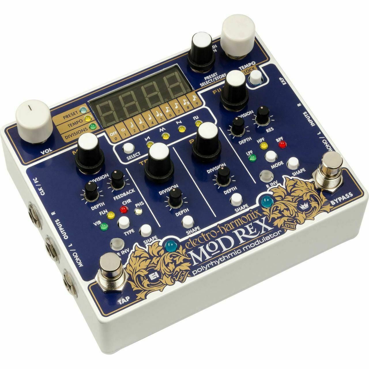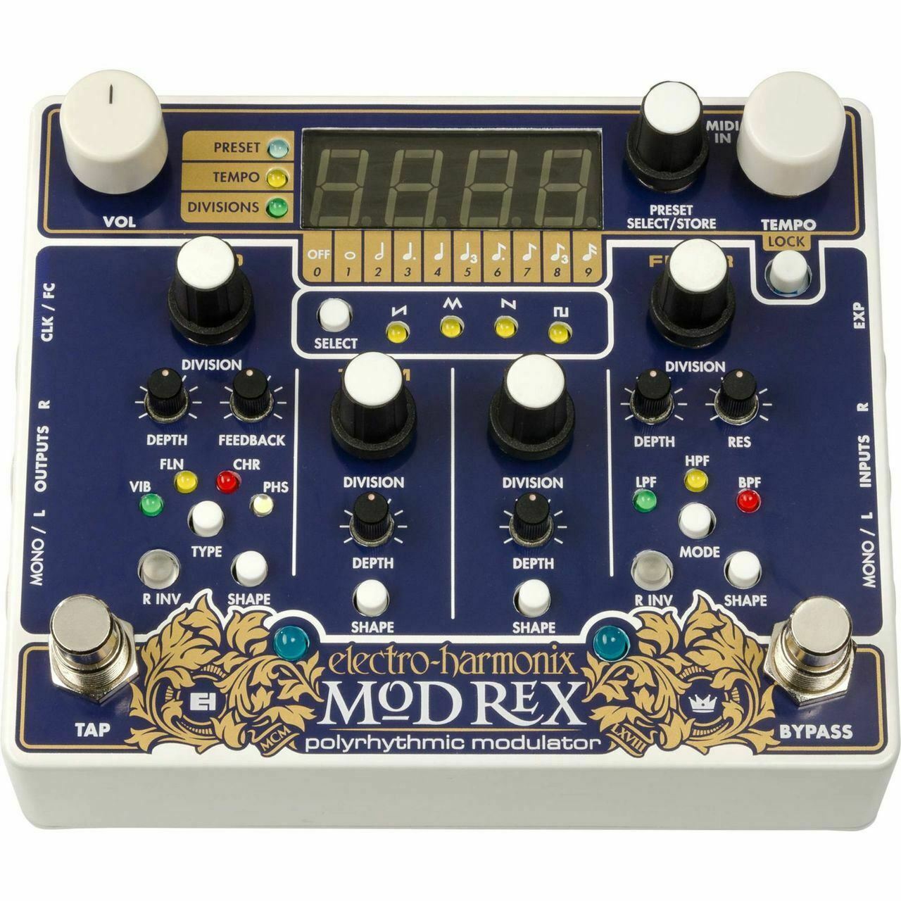 With four independent modulation effects sections synced in time, the Electro-Harmonix Mod Rex Polyrhythmic Modulator pedal offers new ways to add dimension and motion to your sounds. Whether you play electric guitar, bass, synthesizer, or another electronic instrument, Mod Rex packs a ton of creative potential. True stereo operation allows you to craft expansive panning effects. Nine different note-length choices allow you to dial in polyrhythmic effects. And with the ability to control its tempo via the Tempo knob, the Tap tempo footswitch, the expression input, or via MIDI clock, the Electro-Harmonix Mod Rex Polyrhythmic Modulator pedal is ready to integrate into any music production environment.