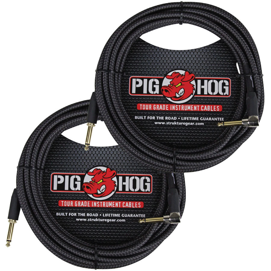 2 Pack Pig Hog PCH20BKR Black Woven ¼” TO ¼” Right Angle Instrument Cable, 20ft