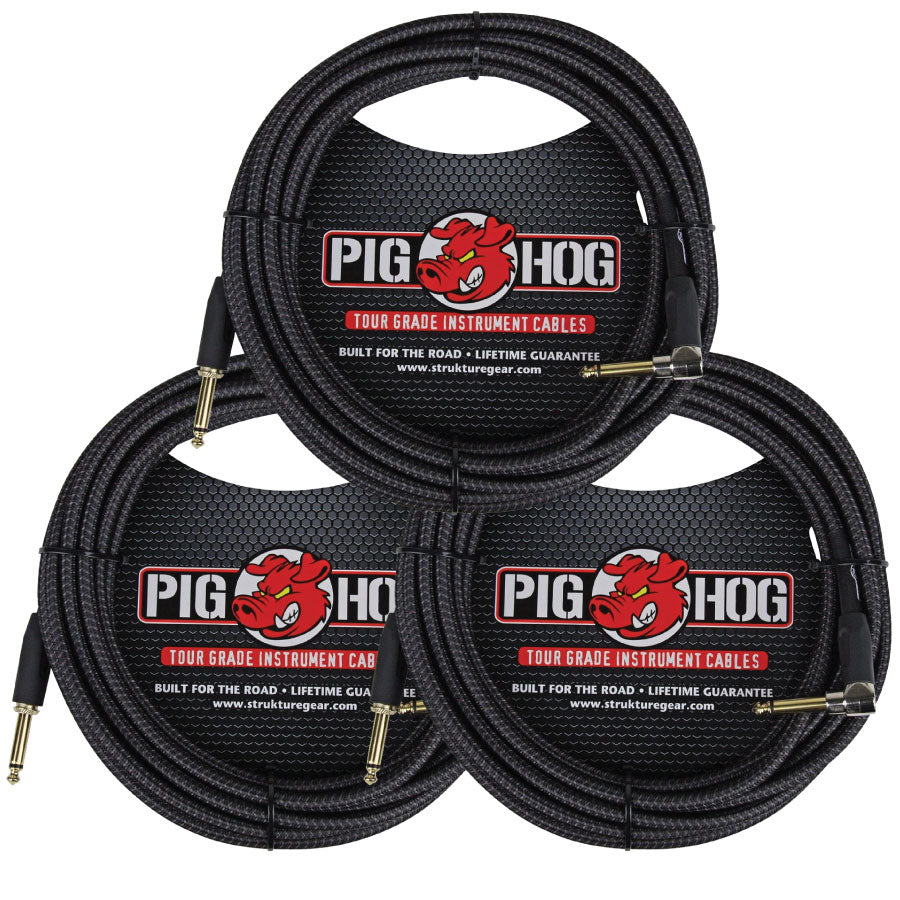 3 Pack Pig Hog PCH20BKR Black Woven ¼” TO ¼” Right Angle Instrument Cable, 20ft